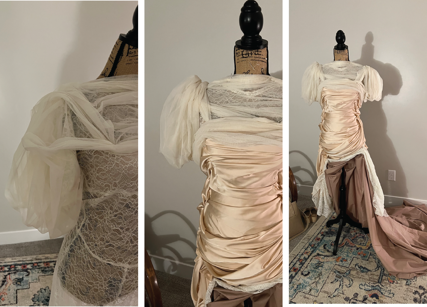 I refused to cut the lace until I knew exactly how I wanted the sleeves. It was a 1 shot thing and I was not about to ruin the antique lace. I tested out a few patterns using tulle and cheap lace. I figured out the main, tight forearm of the sleeve, but really struggled with the armpit. For some reason, my head couldn’t wrap my head around figuring out how to structure the armpit– given I was working with circumference measurements. I also wanted it to hang off my shoulder. Trying to figure out the armpit and how it was going to not only connect to the dress but keep the dress up was extremely frustrating and discouraging. I walked away many times frustrated and coming back to it over and over with no luck.