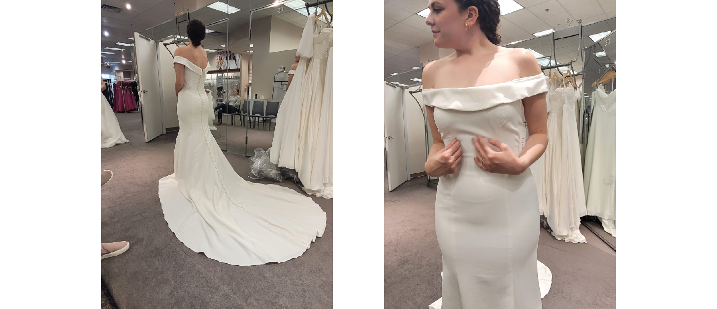 Later, as I’m showing my friend all the photos from the shopping trip and telling her what I was finding and loving, as I got to the final dress reveal, I felt a pit in my stomach: I hated it. I didn't like how the dress looked on my body at all and couldn't fathom what I had been thinking then. I became frustrated and discouraged--spending my days grueling over what to do. I flipped through the photos dozens of times in frustration until I realized something. As I painstakingly analyzed each picture, I couldn't stop thinking of the mermaid dress. It was tighter throughout the bodice and skirt, as is expected in a classic mermaid style, but included beautiful princess seams and an elegant off-shoulder sleeves and neckline.