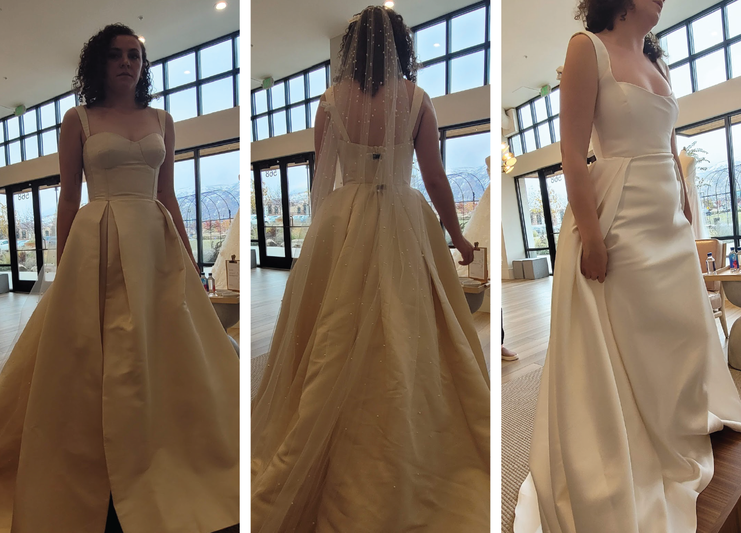 I had the most fun trying dresses on at this shop. Toward the end, I started to really love unique seams, such as under the bra cup or on the side somehow. Although so subtle, I felt it added a uniqueness to the dress pattern and accentuated the bust in a lovely way. I was surprisingly really loving an open back and over the shoulders, given neither had been styles I had ever tried. I wanted the fabric to be soft and was starting to lean more toward tulle, satins, and flowy materials. Those fabrics felt luxurious and ethereal to me. I knew I liked fun pleats on the skirt, adding dimension and fullness and a tight fit that flattered the bust. I was beginning to gather different puzzle pieces of a dress, I didn’t yet have a full vision of.