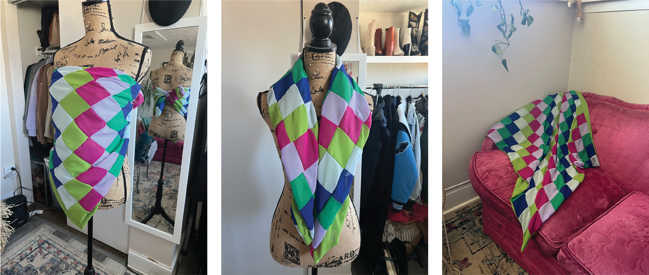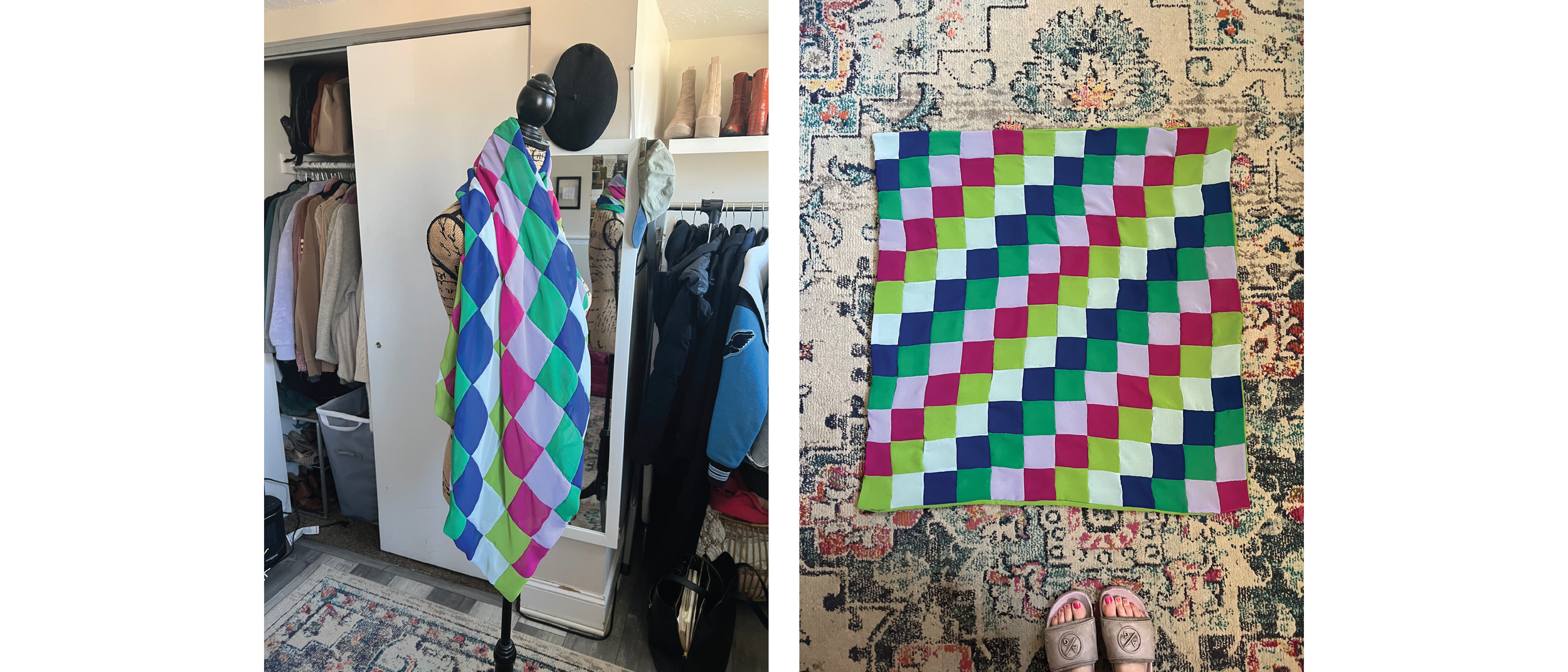The pattern was simple. I decided I wanted the scarf to be a 36”x36” square. Each piece would be 3.5”x3.5”, 0.5” accommodating for seam allowance. Overall, it would be 12 rows and 12 columns, totaling in 144 squares.